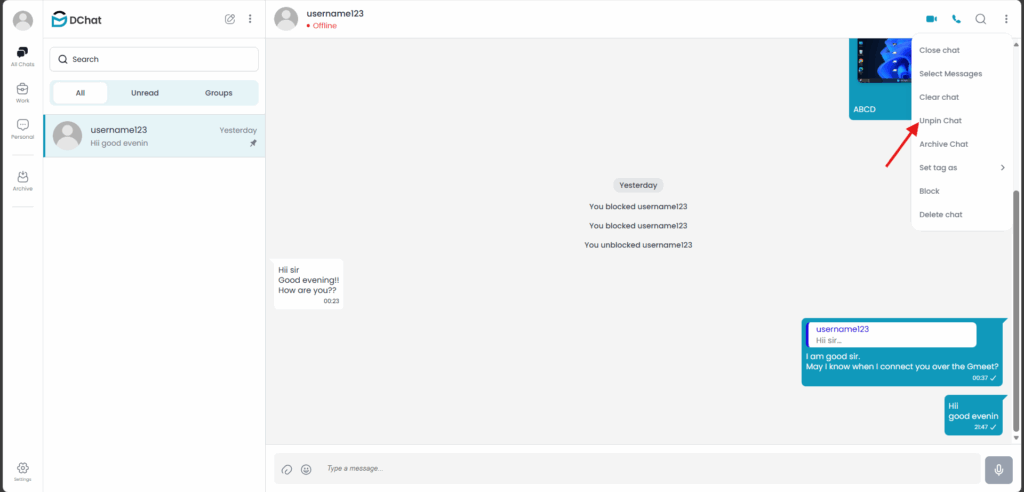 Step2:- click on “unpin chat” and your chat will be unpinned.