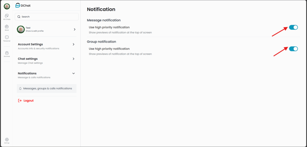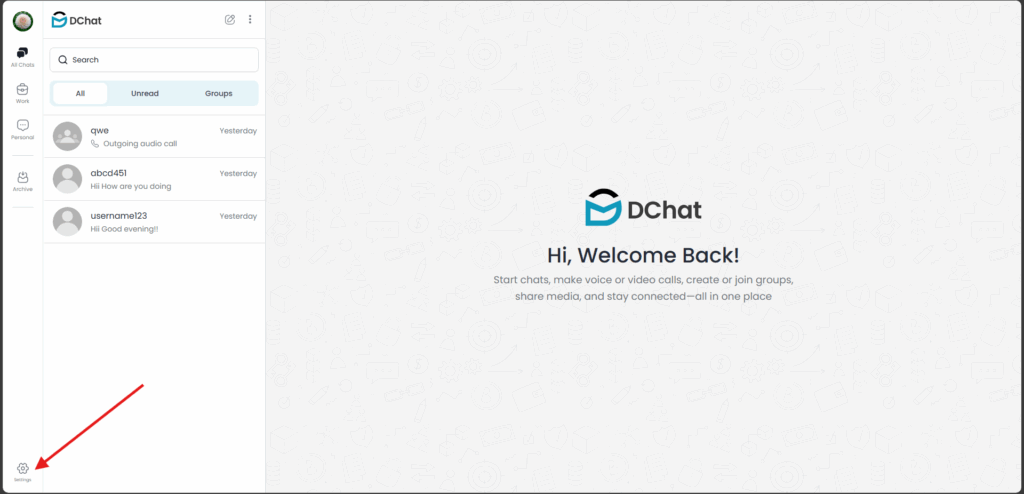You can change your notification settings for all calls and messages in DChat Settings. Here is how: