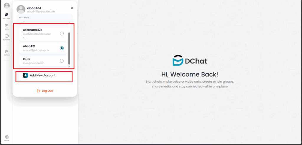 DChat allows you to have multiple accounts on a single Android device. Your active account is the one you’re currently logged into. But, you can easily switch account whenenever you want.