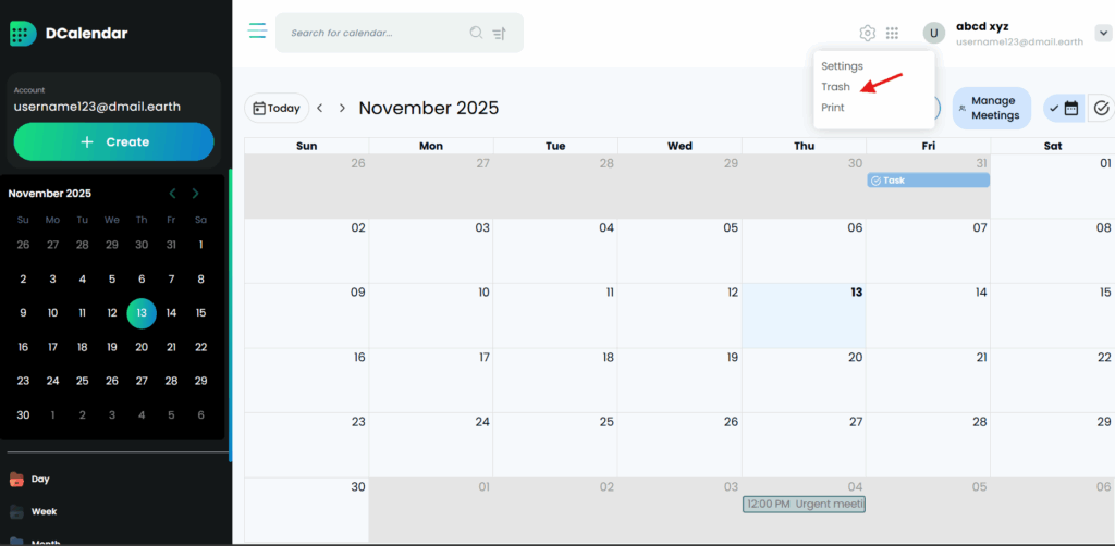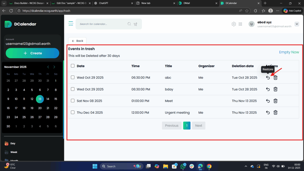 Step3:- Click on the second option”Trash” in which you will be able to view the deleted event as shown below