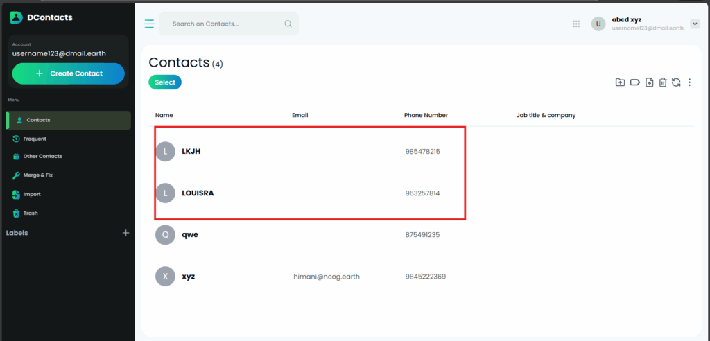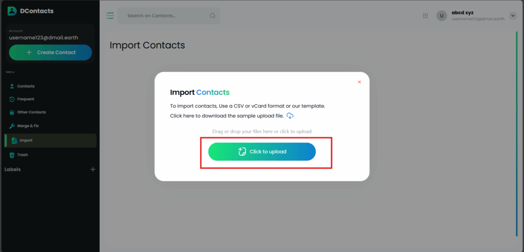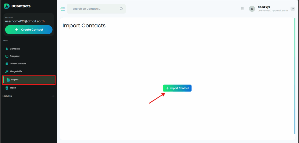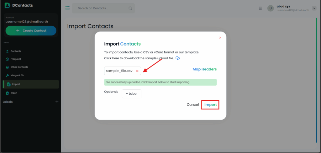 DContacts Guide to Import Contacts in DContacts Estimated reading: 1 minute 46 views Importing contacts allows you to quickly add multiple contacts from a saved file.. This feature is useful when switching devices, restoring backups, or transferring contacts from another platform. Step 1: – Log into Dcontact or your device. Step 2: – The window will pop as shown below Step 3: – Click on the “Import” tab on the left side of the Dashboard.Click on the Import Contact. Step4: -You will be asked to Import file, and it must be in CSV or vCard format.If you don’t know about the format, initially you can download the format, and add details to it and Save the File.Contact Details & other details required are added and the file is saved in the specific format required. Step5: – Click to Upload the file, add the file. Step 6: – After the selecting the Particular File, the window will pop to confirm.Click on the “Import” tab. Step7: – The data is Imported and your Imported Contacts can be seen in Contacts Tab where all other contacts are AvailableAs you can see in the below screenshot, we imported two contacts.