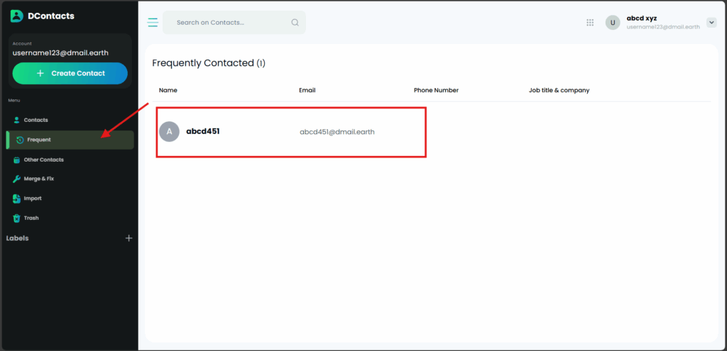 DContacts Manage Frequent Contacts in DContacts Estimated reading: 1 minute 34 views The Frequent feature in DContacts helps you quickly find the contacts you interact with the most. It automatically lists your commonly used contacts based on your activity, so you don’t have to search every time. This makes communication faster and more convenient. Step 1: – Log into Dcontact or your device. Step 2: – This window will pop as shown below Step 3:- On the left side you will find the “Frequent” Tab, click on it as shown below.Here you will see a list of contacts you interact with often. What You Can Do in the Frequent SectionYou can: Quickly Call or Message frequent contacts Open the full contact details View recent interactions Add to Favorites for even faster access This feature saves time by removing repeated searching. How DContacts Decides Frequent ContactsDcontacts automatically updates this list based on: Calls made and received Messages sent and received How often you open that contact’s details Recent activity ranking No manual setup is required — it updates in real time.