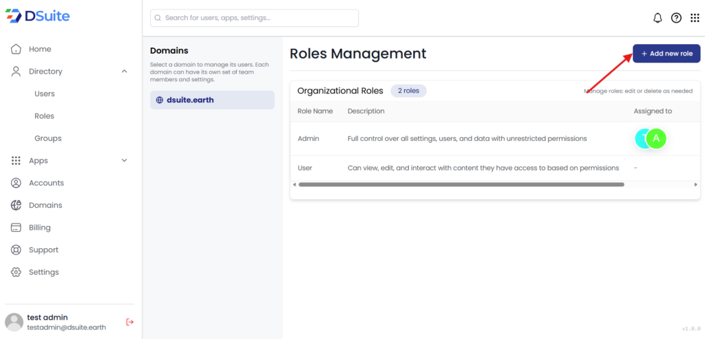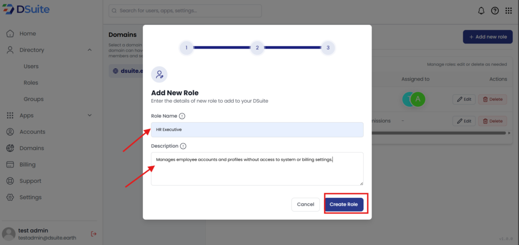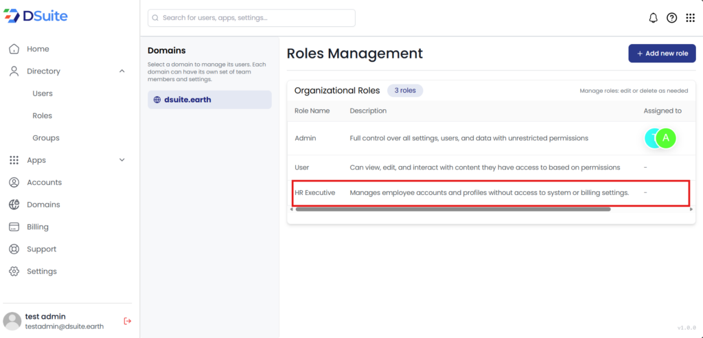 DSuite Add New Role in DSuite: Step-by-Step Guide Estimated reading: 1 minute 56 views Role Management in DSuite allows administrators to define what users can see and do within an organization. Using roles helps maintain security, control access, and manage responsibilities efficiently. Admin – Full control over settings, users, and data User – Limited access based on granted permissions Step 1: Log into your Dsuite Account. Step 2: Click on the “Directory” on the left-hand side of the Dashboard. Step 3: Click on the “Roles” under Directory Tab as shown below. Step 4: Click on “Add new role” on the top right-hand side. Step 5: Add “role name”, Clear description.For example: – We have added Role name as “HR Executive” and Role Description as “Manages employee accounts and profiles without access to system or billing settings” Step 6: Click on “Create Role” the role will be created.Image attached below for your reference.