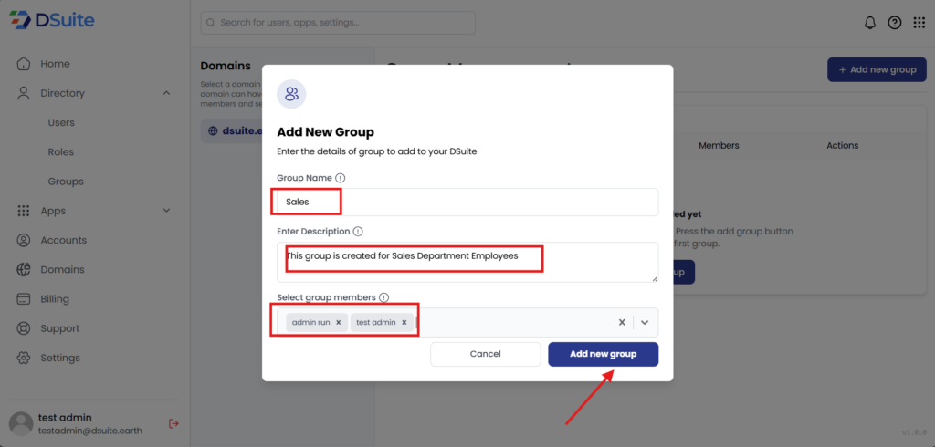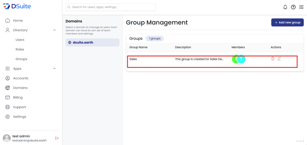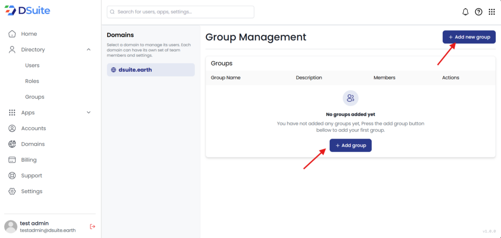 DSuite DSuite Group Management – Add New group Estimated reading: 1 minute 71 views The Group Management feature in DSuite helps administrators organize users into groups for easier access control, communication, and management. Step 1: Log into your Dsuite Account. Step 2: Click on the “Directory” on the left-hand side of the Dashboard. Step 3: Click on the “Groups” under Directory Tab as shown below. Step 4: Click on “+ Add new Group” on top right-hand side or you can also click “+Add group” appearing in middle of the dashboard as shown below. Step 5: The Window will appear, add details like Group name, Description and add group members.Click on add new group at the bottom. Step 6: New group will be formed, and it will appear like as shown below.
