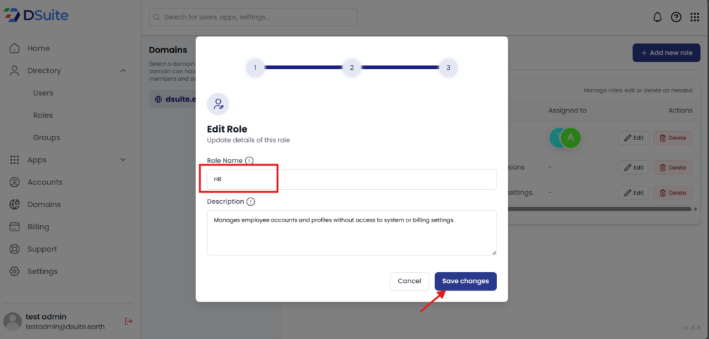 DSuite Edit an Existing Role in DSuite Estimated reading: 1 minute 42 views Step 1: Log into your Dsuite Account. Step 2: Click on the “Directory” on the left-hand side of the Dashboard. Step 3: Click on the “Roles” under Directory Tab as shown below. Step 4: Click on the “Edit” Option, Modify the role name, its description according to your preference.For Example: – I have changed the role name from “HR Executive” to HR. Step 5: Click on save changes, the changes will be immediately applied to all assigned users.