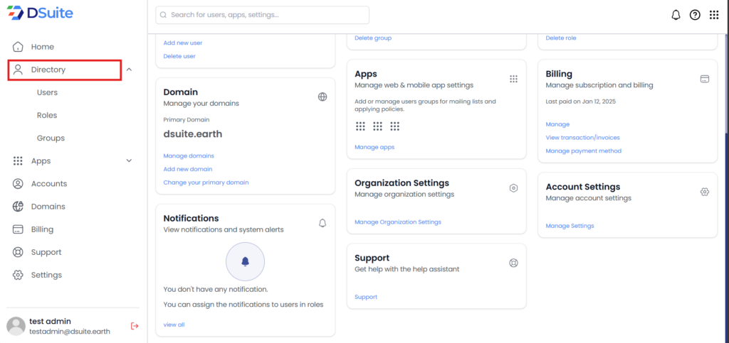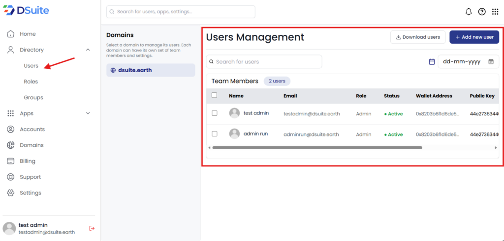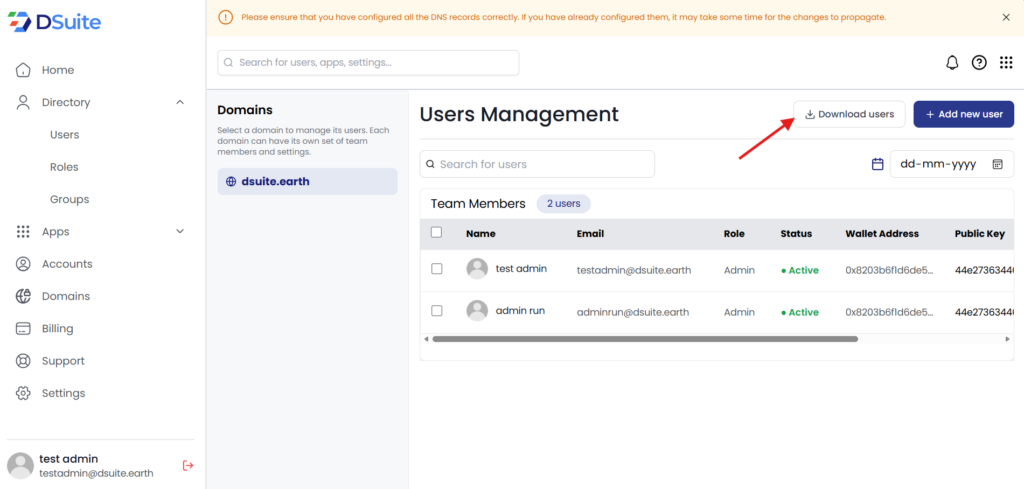 DSuite Manage Users in DSuite: Download users Estimated reading: 1 minute 3 views The Download User feature in DSuite allows administrators to easily download a list of all users in their DSuite account. This feature is useful when you need to keep a record, analyze user data, create reports, or share user information with your team. Step 1: – Log into your Dsuite Account. Step 2: – Click on the “Directory” on the left-hand side of the Dashboard. Step 3: – Click on the “Users” under the Directory.The user management window will be open up. Step 4: Click on the Top “Download user” of the window.Screenshot attached below for your reference. Step 5: – The file will be automatically downloaded which shows the lists of users.