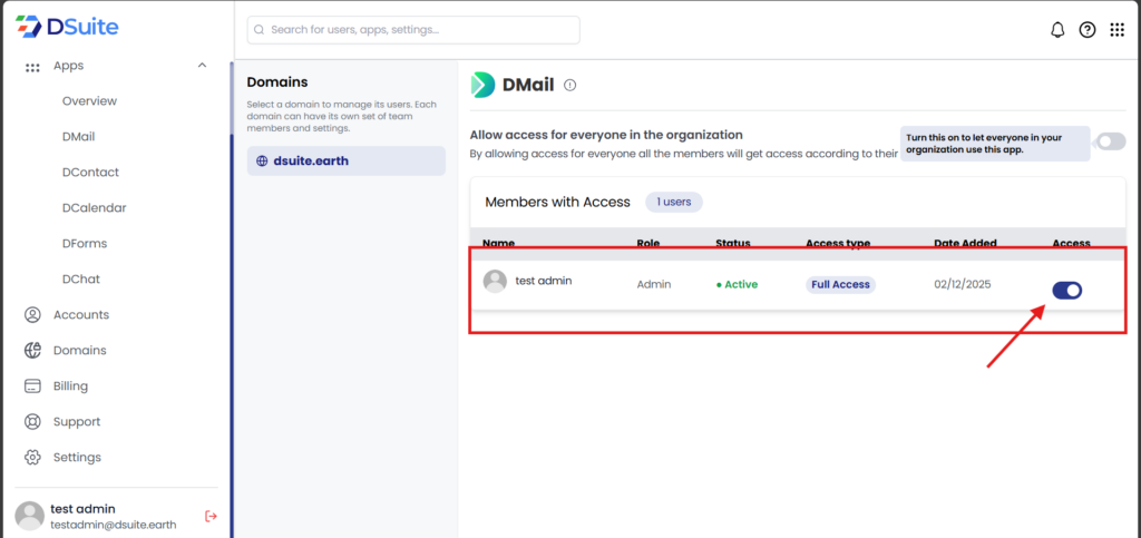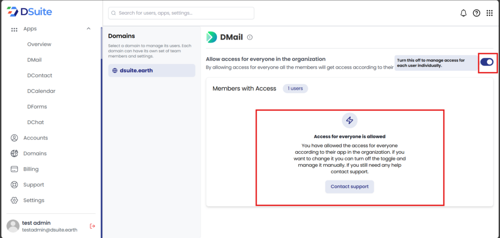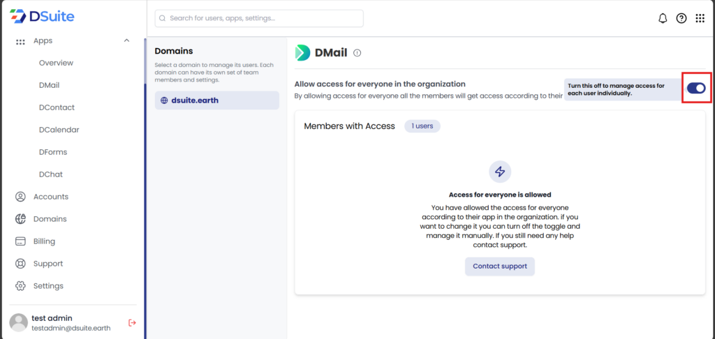 DSuite DMail Settings on DSuite: Application Access Estimated reading: 1 minute 15 views The DMail Settings page in DSuite allows you to manage and control access, forwarding, and aliases for your email service. You can configure these settings based on your requirement to enhance email security, delivery, and identity management. Step 1: – Open Dsuite Account on your Device. Step 2: – Click on the “Apps” on the left-hand side of the Dashboard, Click on Dmail as shown below. Step 3: – The Window will be opened. Application Access Manage application access and permissions for DMail. Step 1: – Click on “Configure” under application process. Step 2: – The window will be opened up, as shown below where access for everyone is allowed. Step 3: – If you want to select any specific user to deny or grant access, click on the on/off Tab on the right-hand side as shown below Step 4: – The Window will be opened up, where you can deny or grant access to the specific user