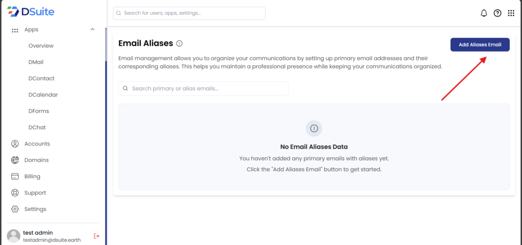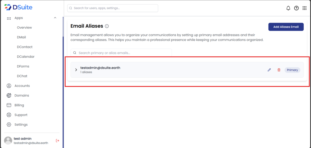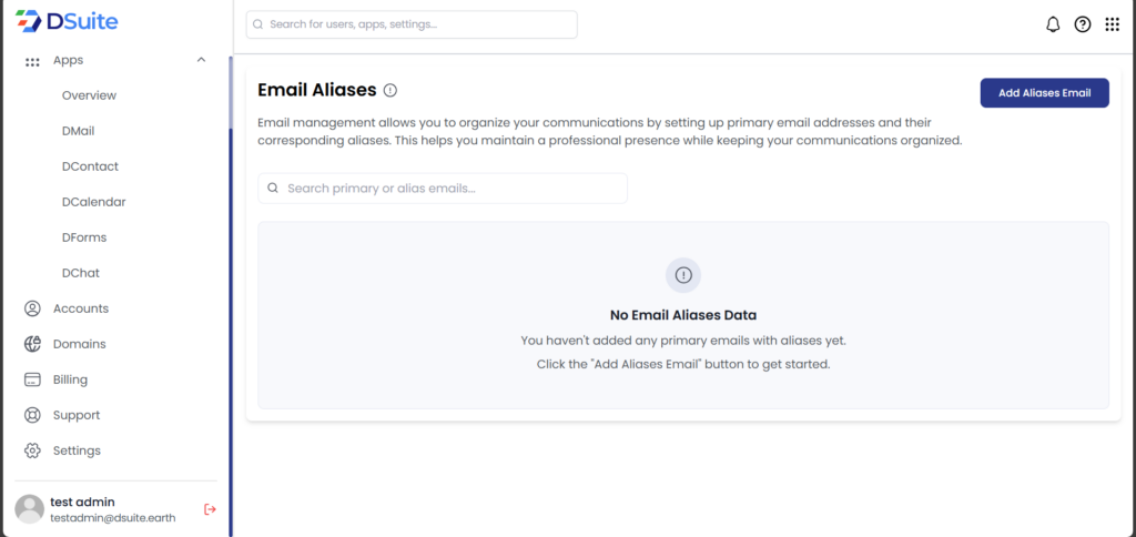 DSuite DMail Settings on Dsuite: Email Aliases Estimated reading: 2 minutes 10 views Email Aliases allow you to create additional email identities that are linked to your primary mailbox. All emails sent to an alias address will still arrive in your main inbox. This helps you manage different roles or purposes without creating multiple accounts. Step 1: – Login into Dsuite Account. Step 2: – Click on the “Apps” on the left-hand side of the Dashboard, Click on Dmail as shown below. Step 3: – The Window will be opened. Configure Email Aliases Step 1: – Click on “Configure” under the Email Aliases.The window will be open up as shown in the below image Step 2: – Click on “add Aliases email” on the top right corner as shown below Step 3: – Add primary Email, this is your main email address that receives all incoming messages. It can be from any domain and must be unique.Alias Email are additional email addresses that forward all incoming messages to your primary email. For example: –[email protected] This is my main email address[email protected] This is an extra email address connected to primary inbox. Step 4: – Click on save tab on bottom right corner, the Aliases Email will be created. Primary Email → Your original, main email Alias Email → Extra email name that also reaches the same inbox