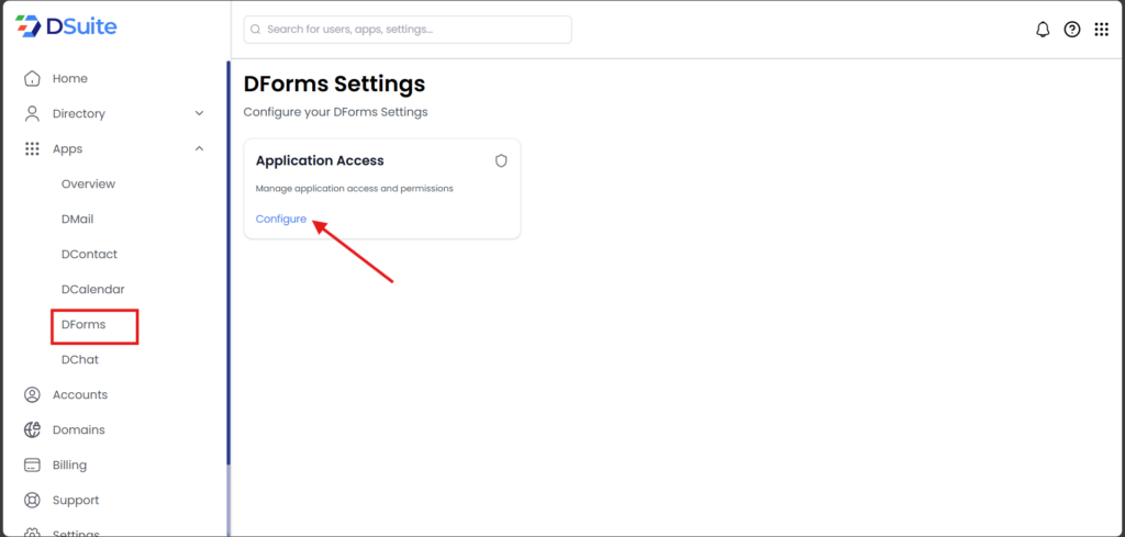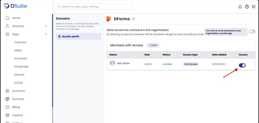 DSuite DForms Settings on DSuite: Application Access Estimated reading: 1 minute 11 views DForms Settings allows administrators to manage how users in the organization access the DForms application like who can use Dforms, what level of access they have and enabling and disabling specific members Step 1: – Login into Dsuite Account. Step 2: – Click on the “Apps” on the left-hand side of the Dashboard, Click on DForm as shown below.The window will be opened up. Configure Application Access Option 1: – If toggle is “ON” it means you have allowed access for everyone in the organization. Option 2: – Allow Access to specific users, Turn the toggle “OFF”