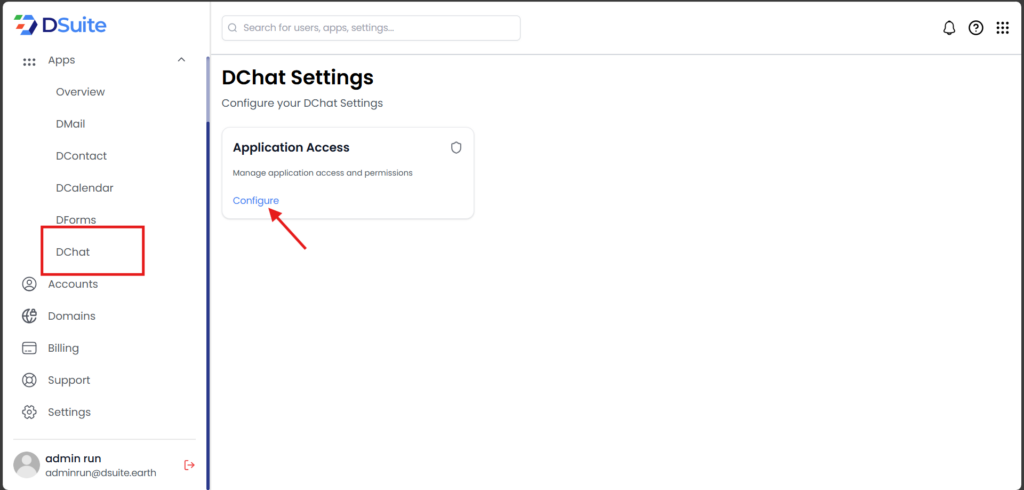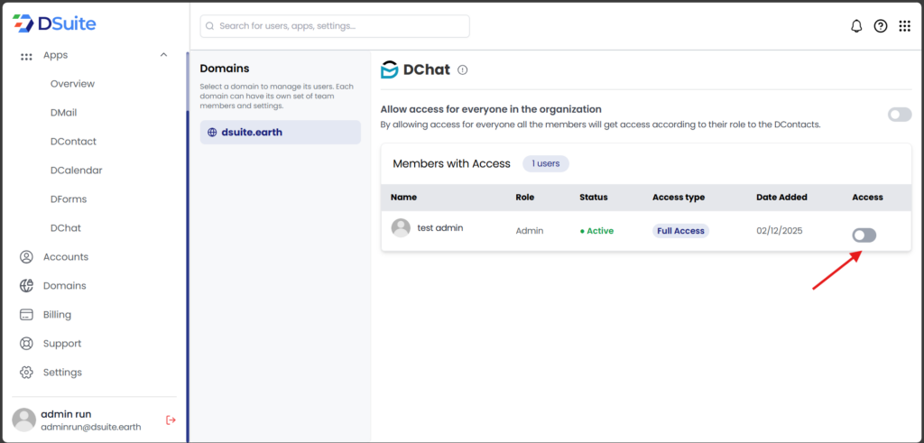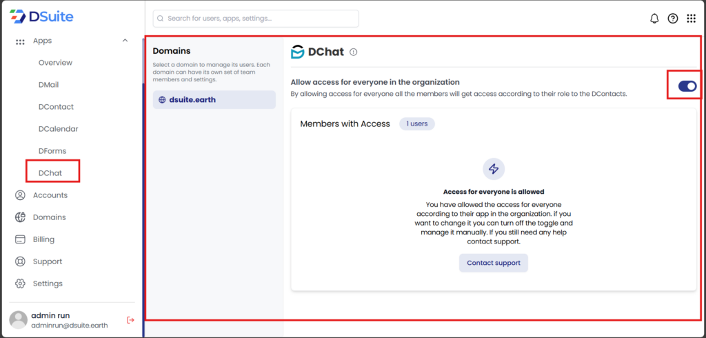 DSuite Dchat Settings on DSuite: Application Access Estimated reading: 1 minute 12 views DChat Settings allows admins to control who within the organization can access DChat like enabling and disabling Dchat for all users, manually managing member access. Step 1: – Login into Dsuite Account. Step 2: – Click on the “Apps” on the left-hand side of the Dashboard, Click on DChat as shown below.The window will be opened up. Configure Application Access Option 1: – If toggle is “ON” it means you have allowed access for everyone in the organization. Option 2: – Allow Access to specific users, Turn the toggle “OFF”
