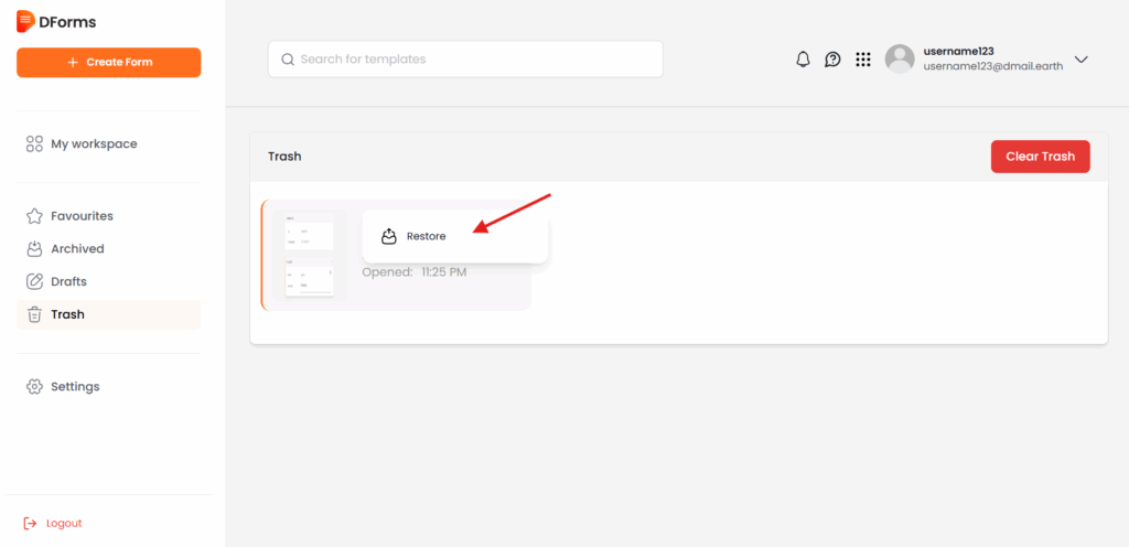 Step 6: – You can also permanently delete the form, by clicking on the ” Clear Trash” tab.