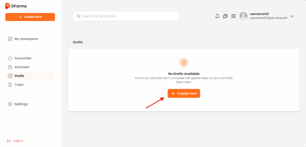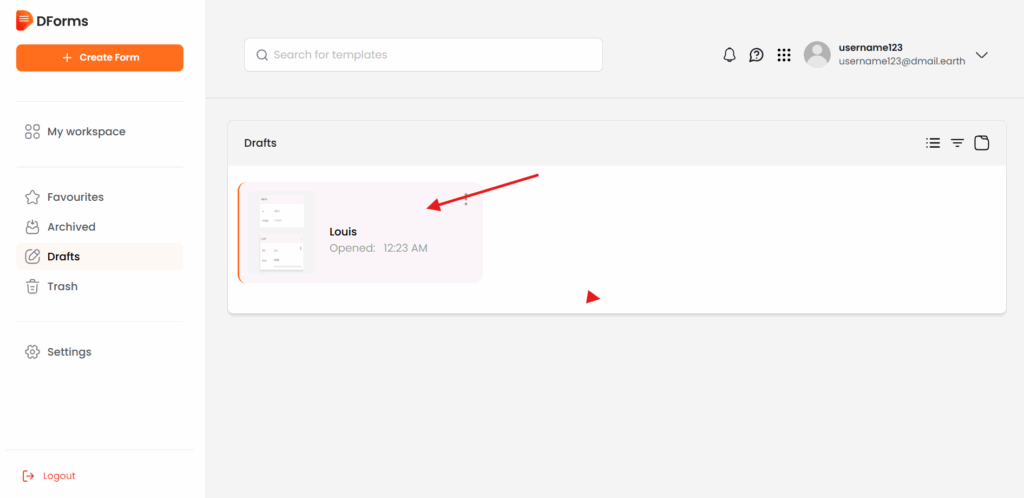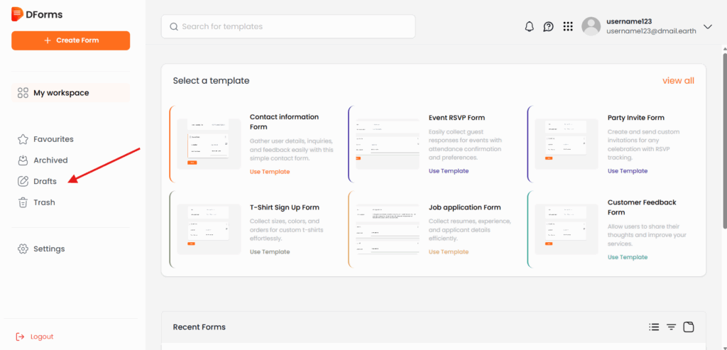 Log into your Dform account, Click on the Draft Tab on the left-hand side.