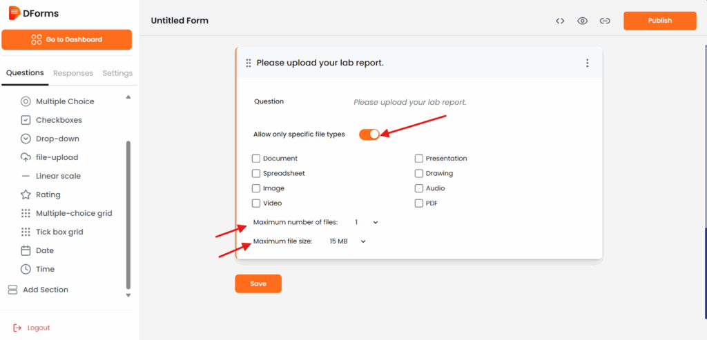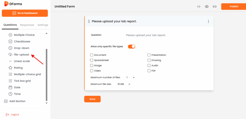 Step6: – Click on the File Upload option on the left-Hand side to start creating a file upload D form as shown below