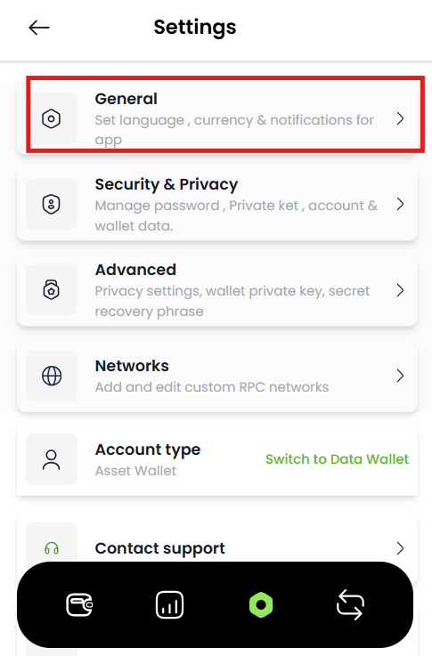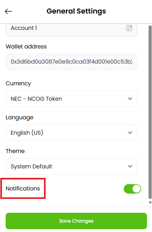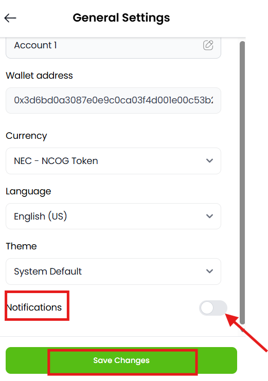 Getting started with Dwallet-Login Guide Enable or disable Notifications Estimated reading: 1 minute 5 views Step 1: Log into your account.The window will appear as shown below. Step 2: Click on the Settings Tab located at the bottom of the Dashboard.Screenshot attached below for your reference. Step 3: Click on the “General” Tab at the top of the Dashboard. Step 4: The window will open up.Notifications Tab will appear the bottom as shown. Step 5: If you want to receive the notification, Click the Toggle “ON” as shown it will appear in green colour.Click on Save Changes at the bottom, the changes you made will be saved. Step 6: If you don’t want to received notifications, “OFF” the toggle.Click on save changes, the changes made by you will be saved.