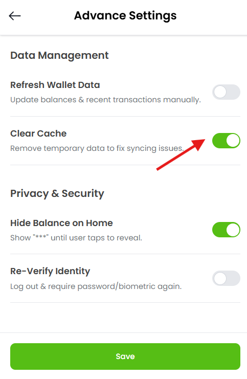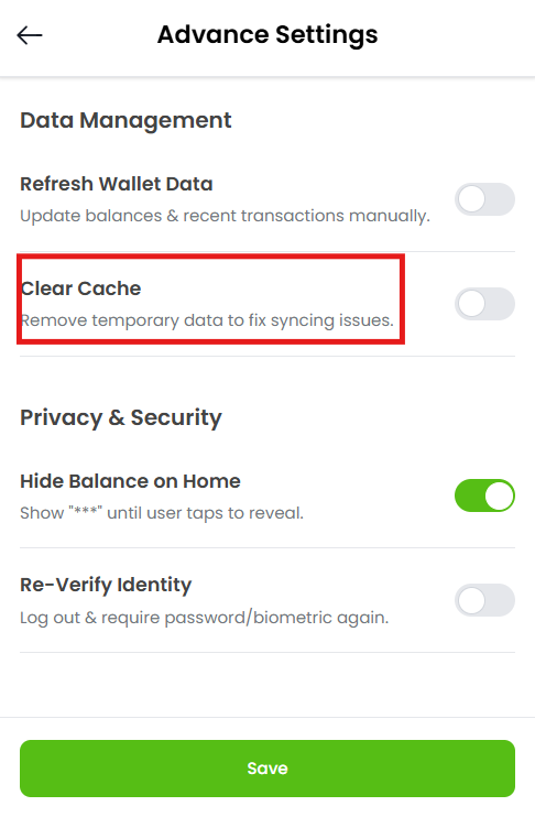 Advanced Settings Improve NCOG Wallet Performance – Clear Cache Guide Estimated reading: 1 minute 8 views This removes temporary stored files that may cause: App slowdown Sync errors Display problems Your wallet, funds, and private keys remain safe. Step 1: Log into your account.The window will appear as shown below. Step 2: Click on the Settings Tab located at the bottom of the Dashboard.Screenshot attached below for your reference. Step 3: Click on the “Advanced” Tab as shown below. Step 4: The window will open up.As you can see the “Clear cache” tab. Step 5: Enable the Clear Cache, “ON” the Toggle as shown below.Temporary files will be deleted, Performance will improve. Step 6: Click on the “Save” Tab at bottom of the Dashboard.