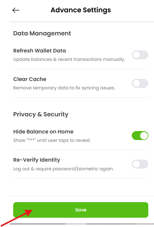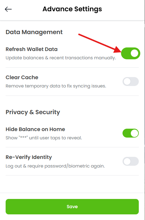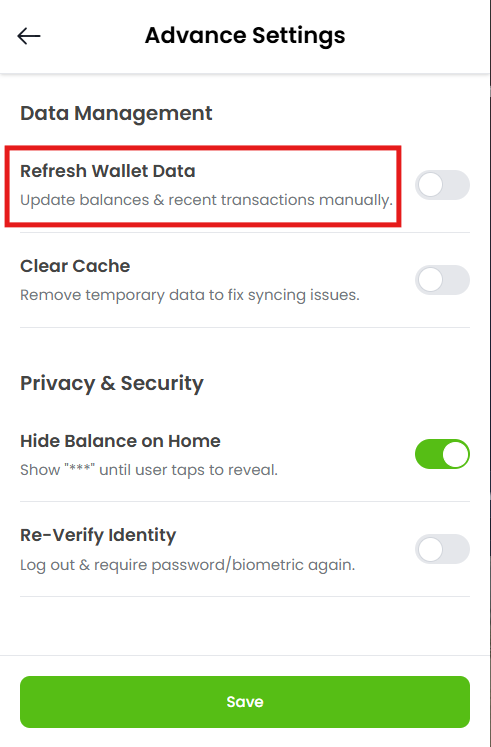 Advanced Settings NCOG Wallet Data Refresh Estimated reading: 1 minute 8 views Step 1: Log into your account.The window will appear as shown below. Step 2: Click on the Settings Tab located at the bottom of the Dashboard.Screenshot attached below for your reference. Step 3: Click on the “Advanced” Tab as shown below. Step 4: The window will open up. Step 5: If you want to refresh wallet data. Tap the toggle next to Refresh Wallet Data.The wallet will start updating information Step 6: If you don’t want to refresh wallet data, keep the toggle “OFF” Step 7: Click on “Save” Tab at the bottom as shown below.