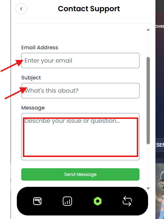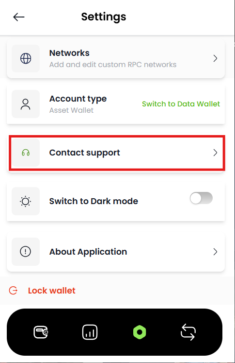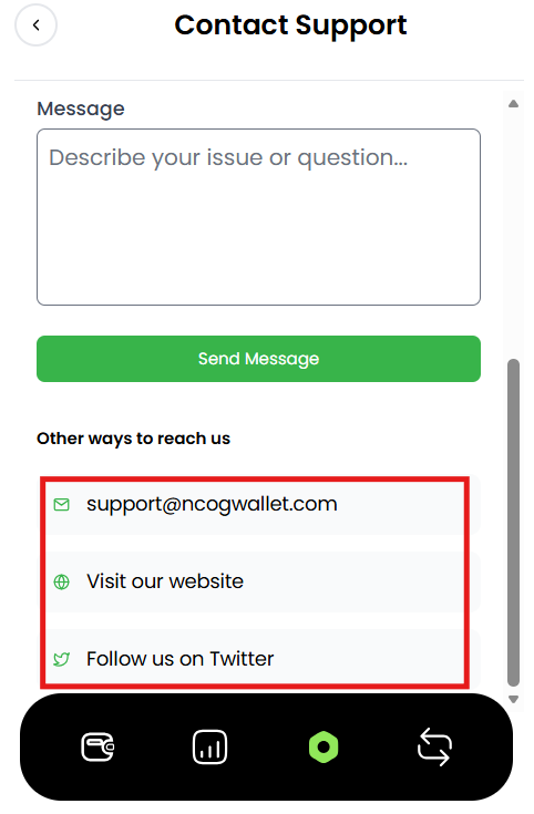 Contact Support NCOG Wallet Customer Support Estimated reading: 1 minute 8 views Step 1: Log into your account.The window will appear as shown below. Step 2: Click on the Settings Tab located at the bottom of the Dashboard.Screenshot attached below for your reference. Step 3: Click on “Contact support” as shown below. Step 4: Add Email, and subject for the issue you are facing and describe it in detail in message. Step 5: Click on “Send message” located at the bottom of the Dashboard. OTHER WAYS TO CONTACT SUPPORT