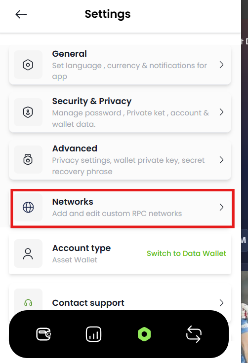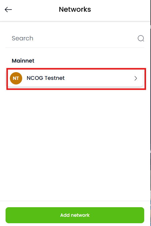 Networks NCOG Wallet Testnet Configuration Guide Estimated reading: 1 minute 8 views This screen allows you to manage blockchain networks inside your NCOG Wallet.You can view, select, search, and add networks such as NCOG Testnet from here. The Networks section lets you choose which blockchain your wallet is connected to.Every network has its own: Coins Wallet balances Transaction history Smart contracts Example:Coins on NCOG Testnet are different from coins on NCOG Mainnet. NCOG Testnet is a testing network used for: Trying transactions Testing smart contracts Learning how the wallet works Test net coins have no real value. They are only for testing. Step 1: Log into your account.The window will appear as shown below. Step 2: Click on the Settings Tab located at the bottom of the Dashboard.Screenshot attached below for your reference. Step 3: Click on the “Networks” Tab as shown below. Step 4: The window will open up.Tap NCOG Test net, The wallet will now connect to this network.
