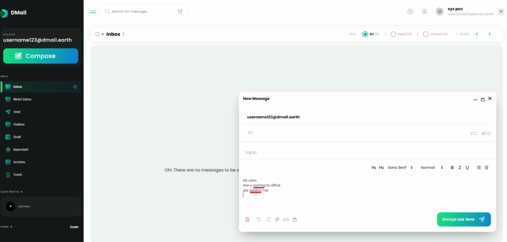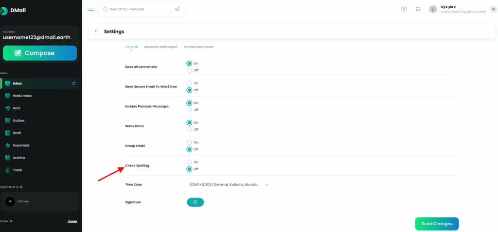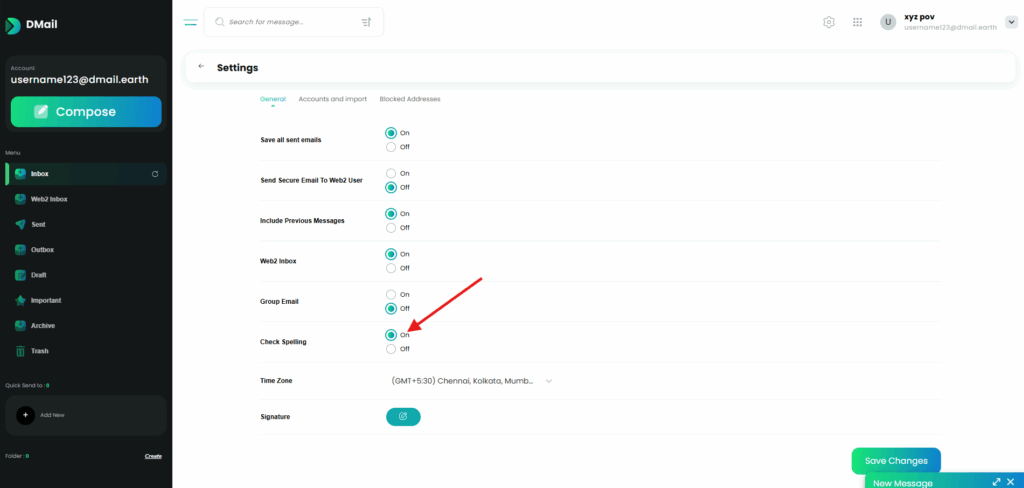 Step 5: – As you can see in the Above screenshot the spelling Tab is on “OFF”, if you are composing a Dmail and the content has a spelling error it will not be highlighted as shown in the below attachment